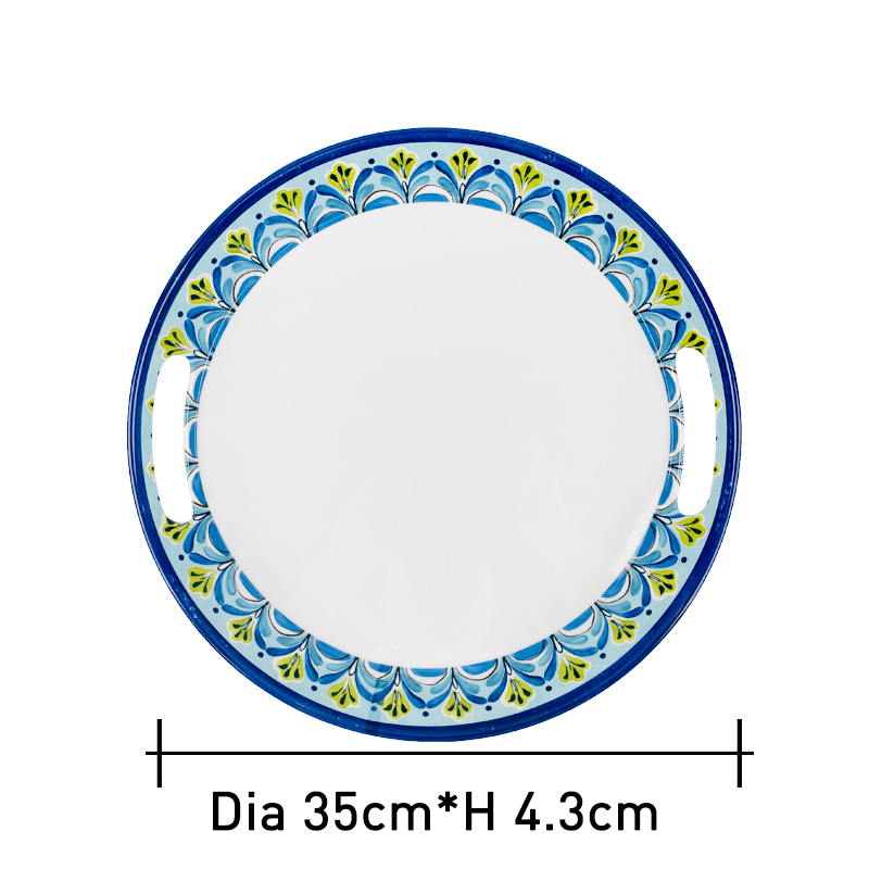 13.8 inch Floral Round Tray Decal Design Melamine Serving Tray for Restaurant Hotel Kitchen with handle Plastic Plate Blue White