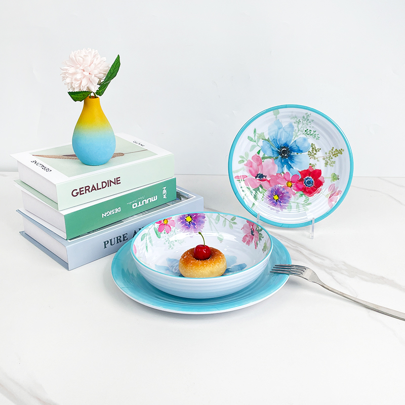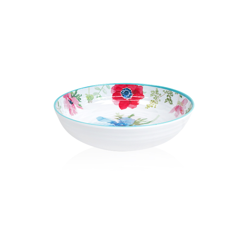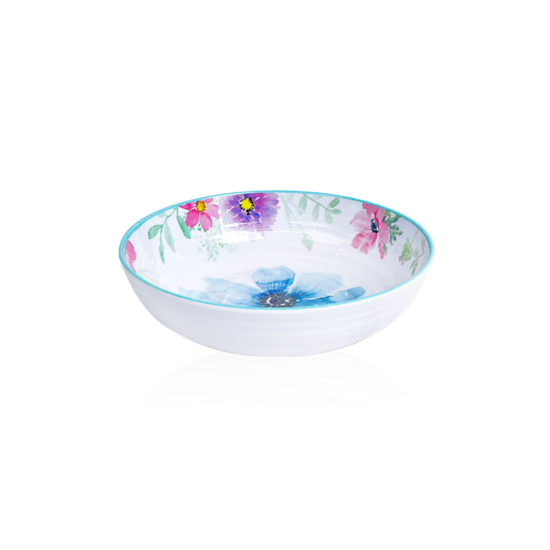 This Watercolor Floral Bowl (and vivid Watercolor Floral Melamine Bowl) features bright, hand-painted-style blooms—soft pinks, bold blues, and vibrant purples (matching the cheerful pattern in the image)—framed by a sleek Turquoise Rim Bowl edge. The whimsical, fresh design turns this bowl into more than just serveware: it makes pasta, salads, or cereal look instantly appetizing, whether it’s on your home breakfast table or a restaurant’s dining plate.