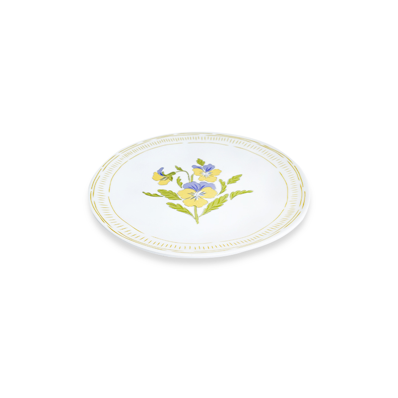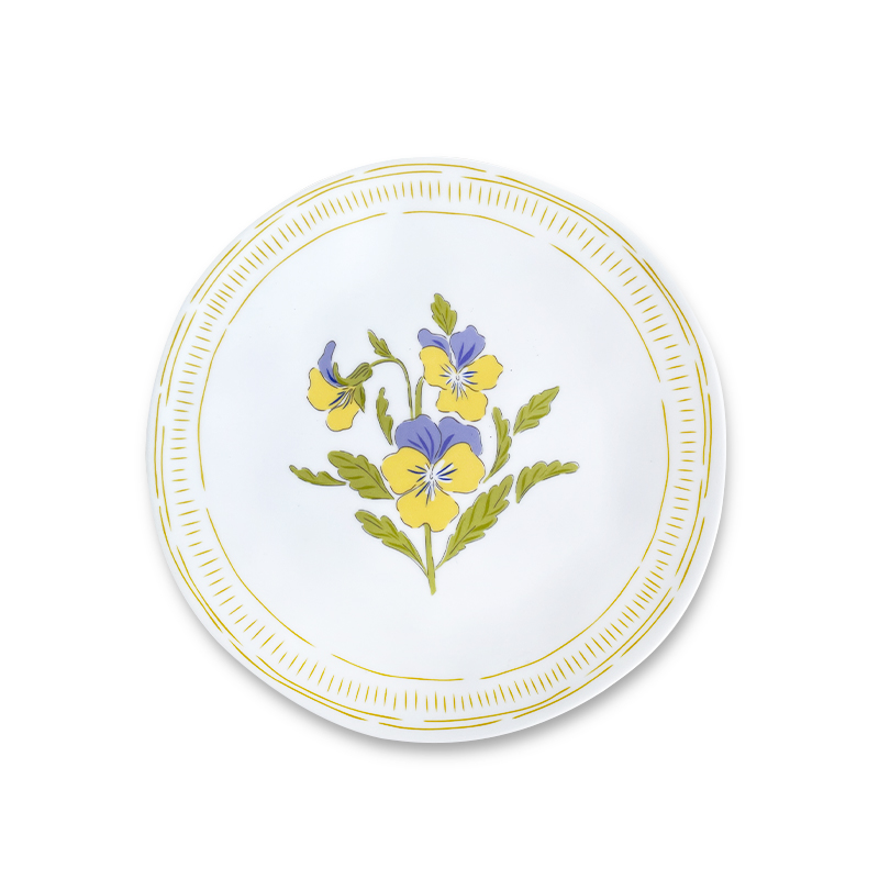 This Pansy Flower Plate (and Pansy Flower Melamine Plate) stars soft yellow-and-purple pansy blooms paired with lush green foliage, centered on a crisp white base to keep your dishes the focal point. Framed by a detailed Gold Trim Plate (also a Gold Trim Dinner Plate) rim—featuring subtle radiating lines that add texture and understated luxury— it turns ordinary table settings into refined, whimsical displays.