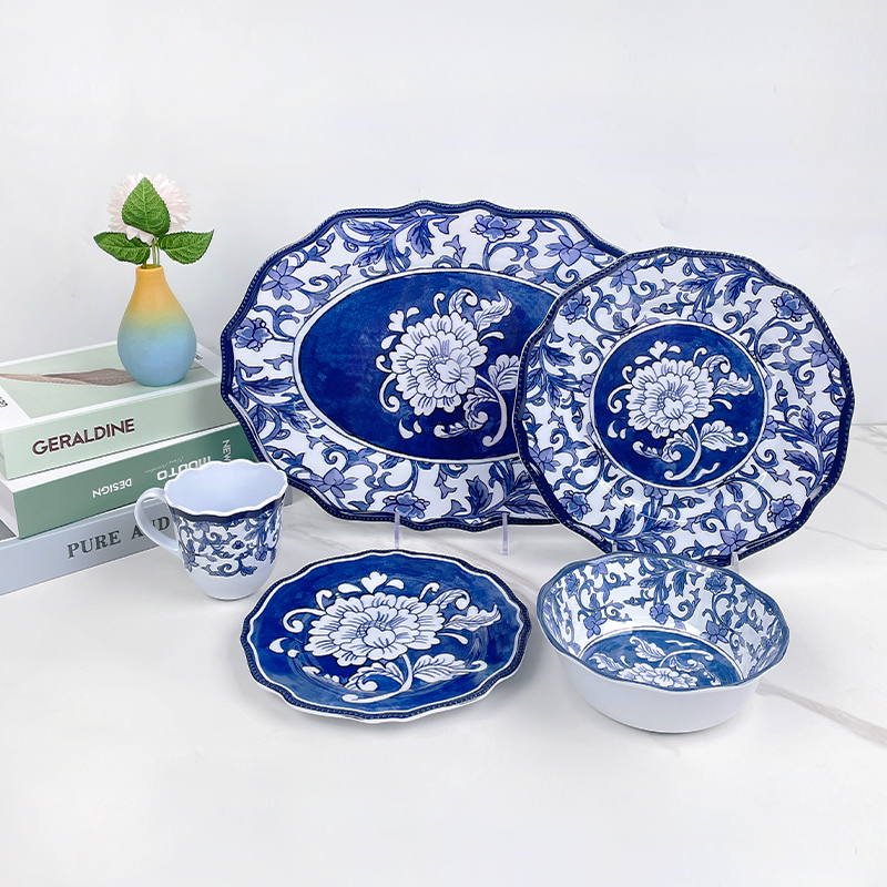 As a Chinese Style Set (and Chinese Style Blue and White Set), this Blue and White Set draws inspiration from iconic Chinese porcelain aesthetics, reimagined in durable melamine. The Peony Floral Set (and Peony Floral Melamine Set) features vivid blue-and-white peony motifs—symbolizing prosperity, good fortune, and elegance—turning every place setting into a meaningful, visually stunning display. Framed by a delicate Scalloped Edge Melamine Set rim, each piece adds subtle textural refinement, balancing classic grace with approachable style.