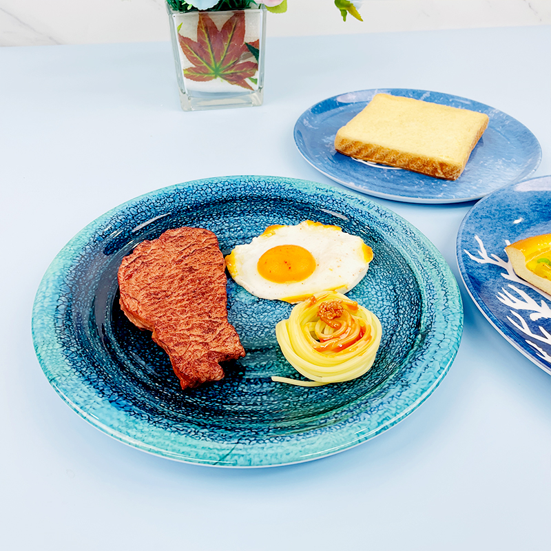 The selling points of blue melamine dinner plates are their durability and versatility. Blue adds a touch of elegance and style to table settings and is suitable for any dining occasion. Additionally, the melamine material ensures that the plates are shatterproof, lightweight and easy to clean, making them a practical and long-lasting option for home and commercial use.