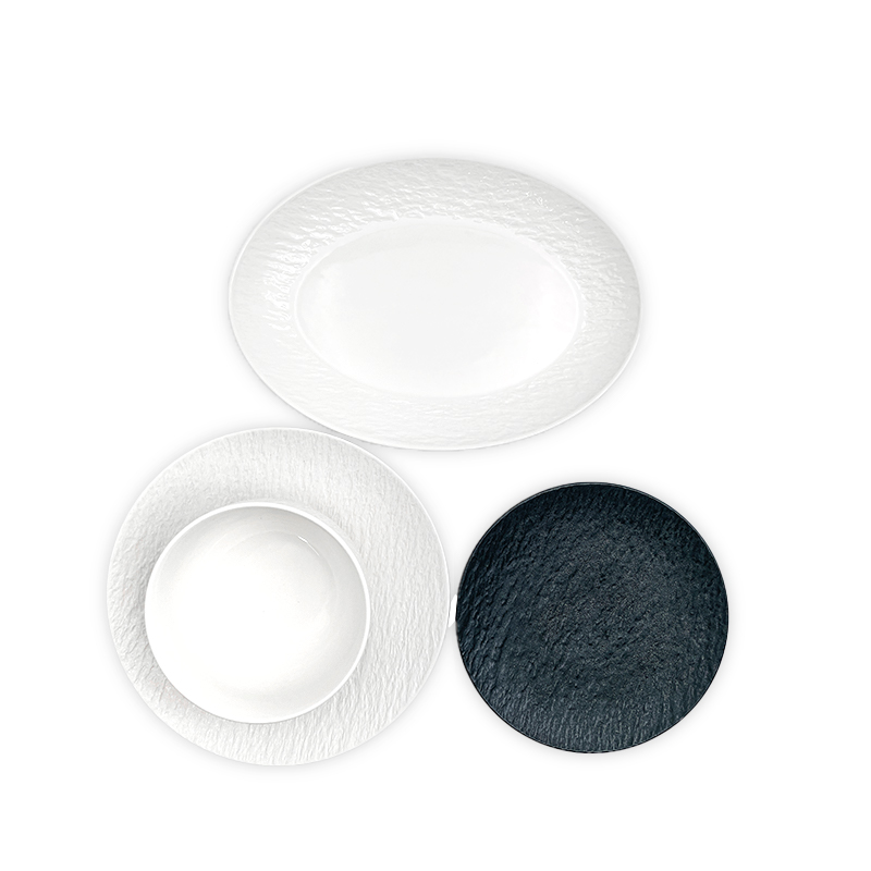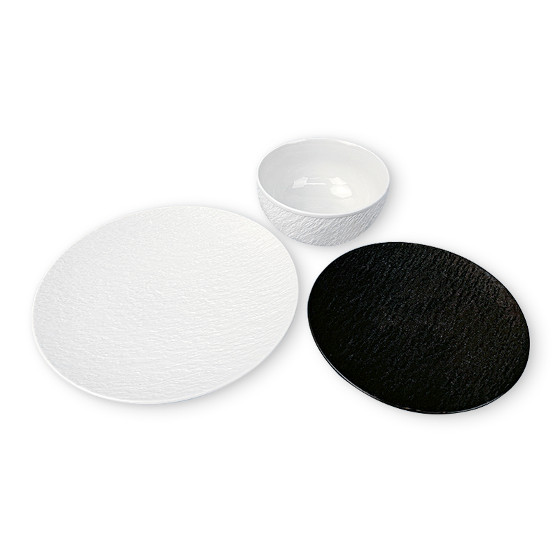 Color & Finish Options: Choose from white or black stone texture finishes to match your venue’s interior design and aesthetic—ensuring your Round Embossed Melamine Dinnerware Set seamlessly integrates with your existing tableware.