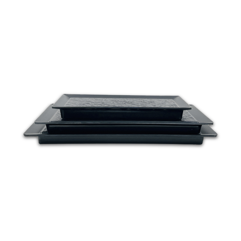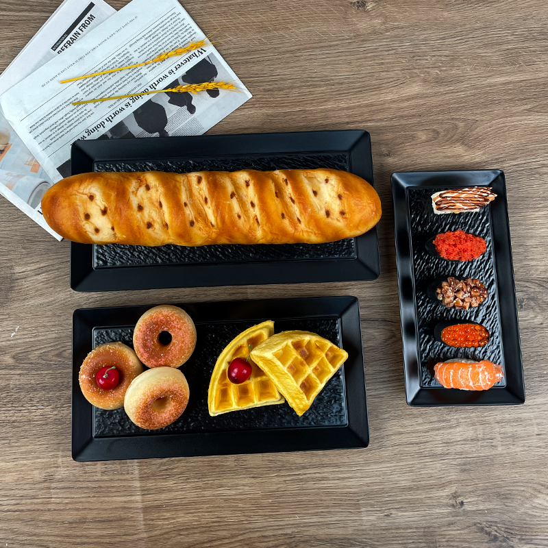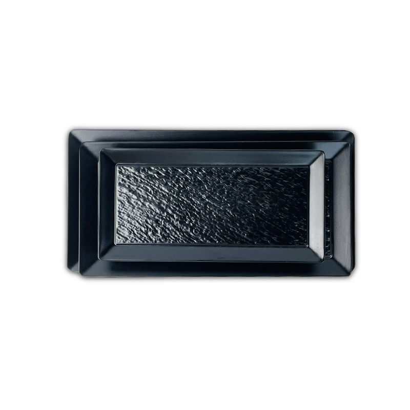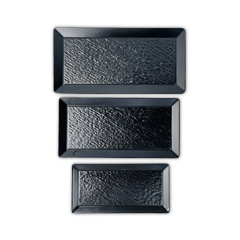 Crafted with a striking black stone texture finish, these black stone trays mimic the organic depth and rugged elegance of natural slate, adding a premium, modern touch to any table setting. The rectangular shape is optimized for commercial plating—ideal for sushi platters, appetizers, main courses, and dessert displays—while the textured surface prevents food slippage and enhances visual appeal. Whether you run a sushi restaurant, a family-style eatery, or a catering company, these rectangular melamine trays instantly elevate your culinary presentation to match upscale hospitality standards.