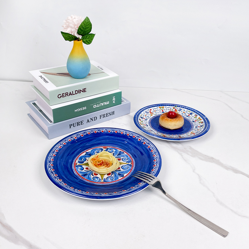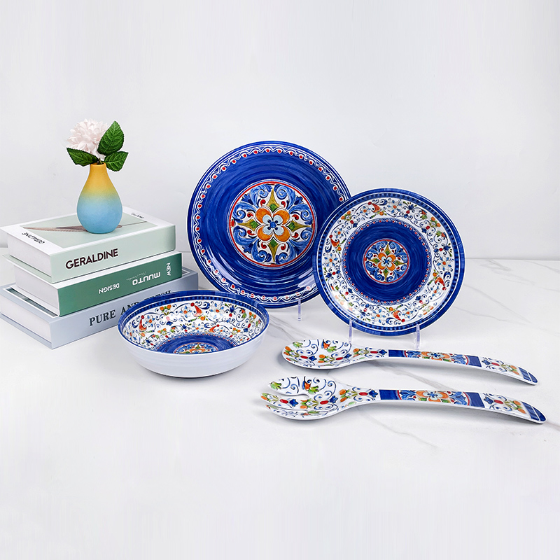 Seata Briosgaidean-bìdh Melamine Flùraichean air am Peantadh le Làimh Meadhan-thìreach - Plàtaichean Gorma, Bobhlaichean, Sgeinean is Forcaichean airson Taigh-bìdh is Biadh aig an Taigh