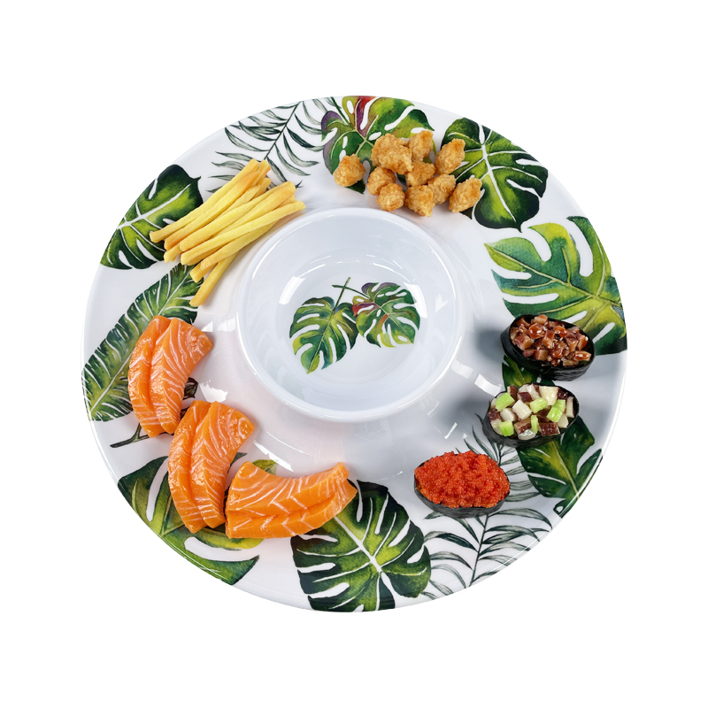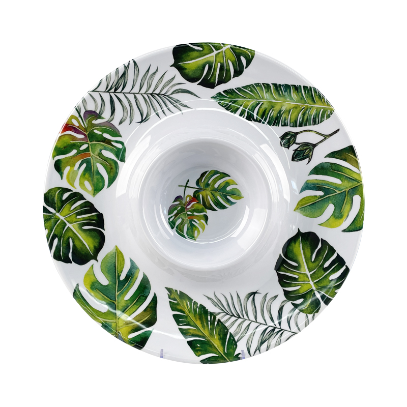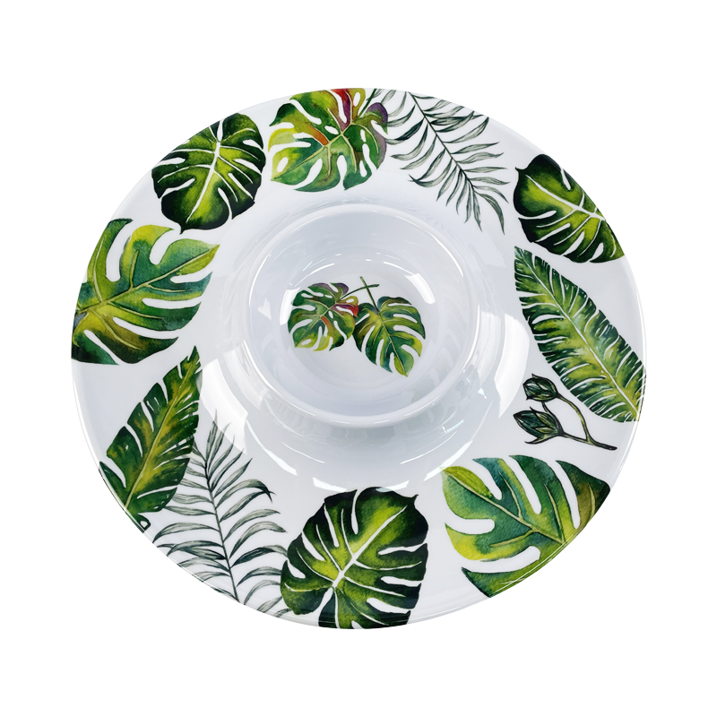 Indoor and Outdoor use 13Inch Round Green leaf pattern Plastic snack Platter Melamine Dip and Chip tray