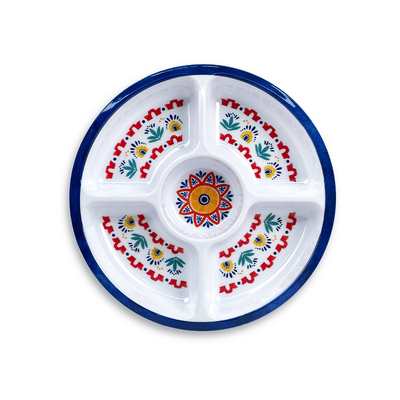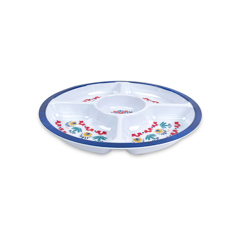 Elevate snack spreads and party presentations with our Wholesale Five Section Melamine Tray—a vibrant Round Multi Compartment Tray that blends festive design, functional storage, and customizable branding, ideal for home gatherings and business needs alike.
