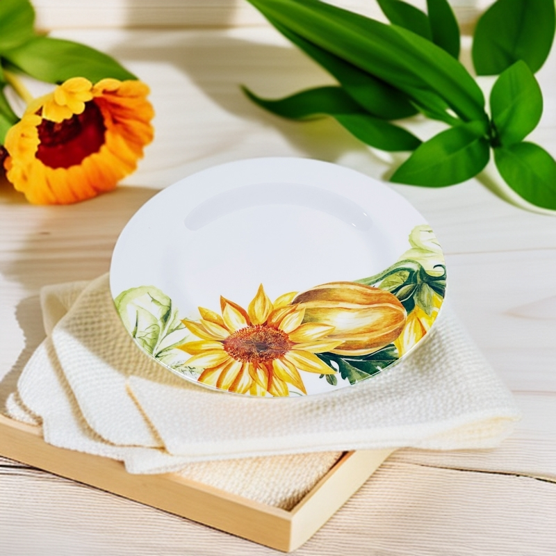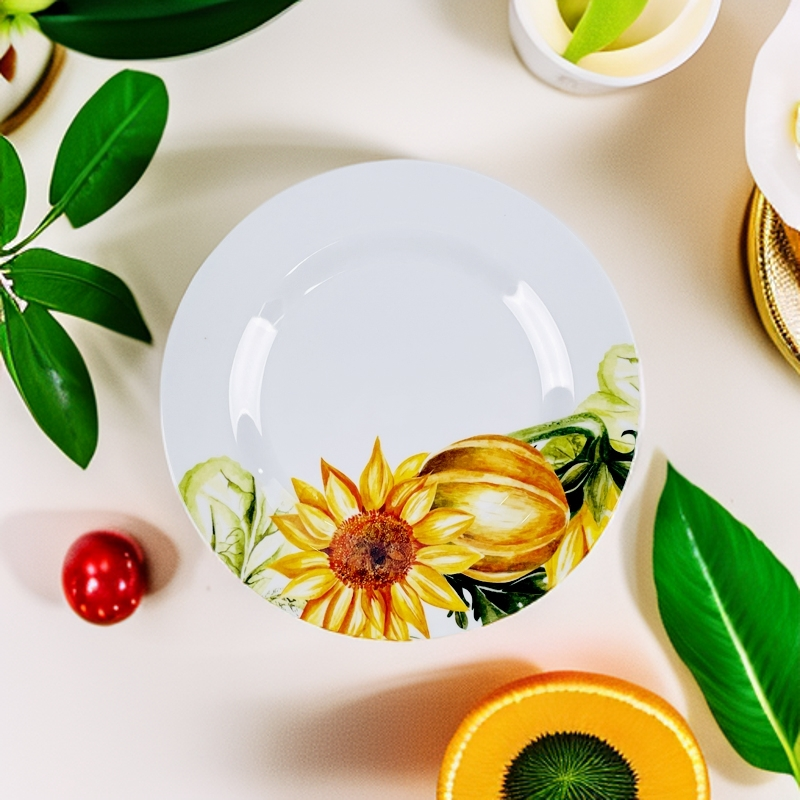 The sunflower shape melamine plate is a delightful and functional addition to your dining collection, perfect for serving fruits, snacks, or desserts. This vibrant plate features an eye-catching sunflower design, making it an ideal fruits plate that brings a touch of cheer to any table setting. Made from high-quality melamine, it is both lightweight and break-resistant, ensuring it withstands everyday use. The melamine plate is designed for versatility, making it suitable for both indoor and outdoor dining occasions. The elegant white sunflower melamine plate adds a touch of elegance and whimsy, making it perfect for picnics, parties, or casual meals. Easy to clean and dishwasher-safe, this sunflower shape plate combines practicality with aesthetic appeal, making it a must-have for any kitchen.