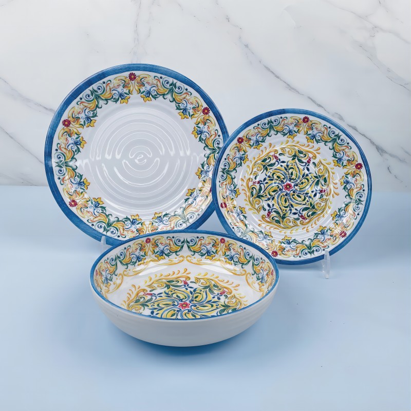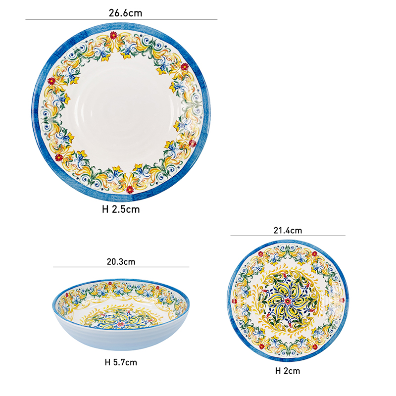 3. Aesthetic Appeal: Melamine dinnerware sets are available in a wide variety of designs, colors, and patterns, allowing customers to choose styles that match their personal taste or home decor.
