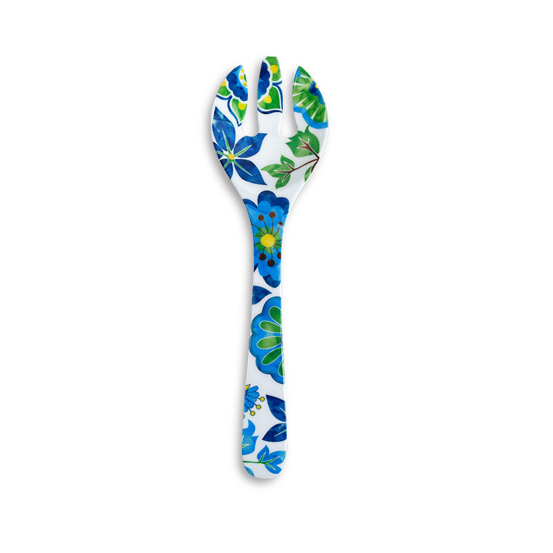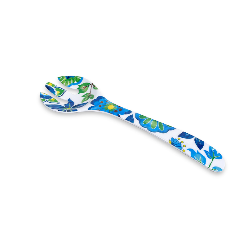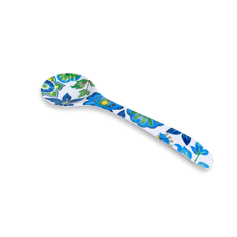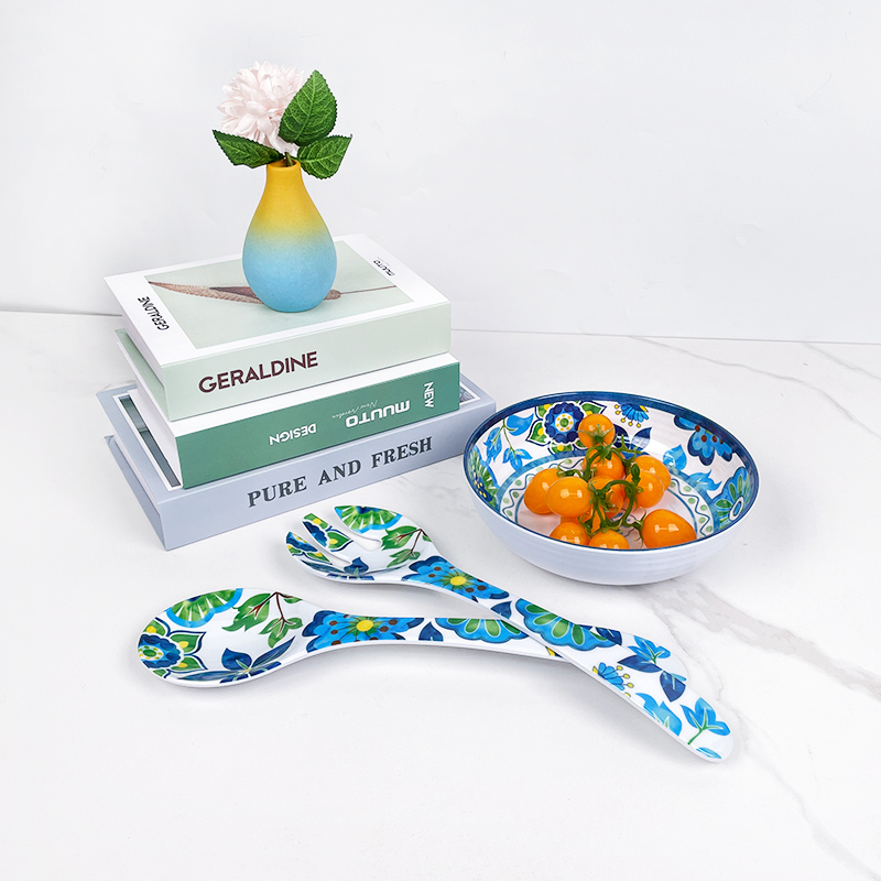 Stor sked i melamin: Ett iögonfallande serveringstema med samma blommönster – perfekt för familjemiddagar eller bufféer.