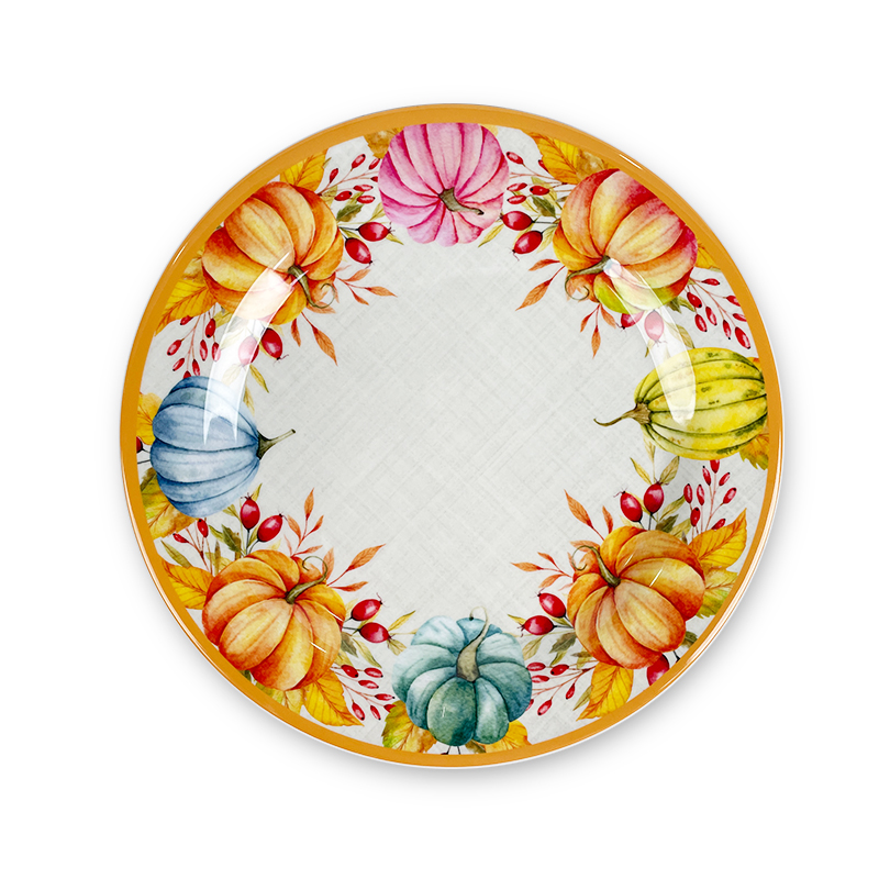 Denna melamintallrik i hemmakök glänser i dagligt bruk – servera frukostpannkakor, pasta på vardagskvällar eller helgbruncher med en touch av höstkänsla. När julen kommer förvandlas den till en Halloween-melamintallrik (perfekt för läskiga snacks och godis) eller en Thanksgiving-melamintallrik (perfekt för att servera rostade grönsaker, pajer eller kalkonskivor). Dess robusta melaminkonstruktion hanterar enkelt hektiska fester och familjesammankomster, vilket gör den till en stapelvara i många år framöver.