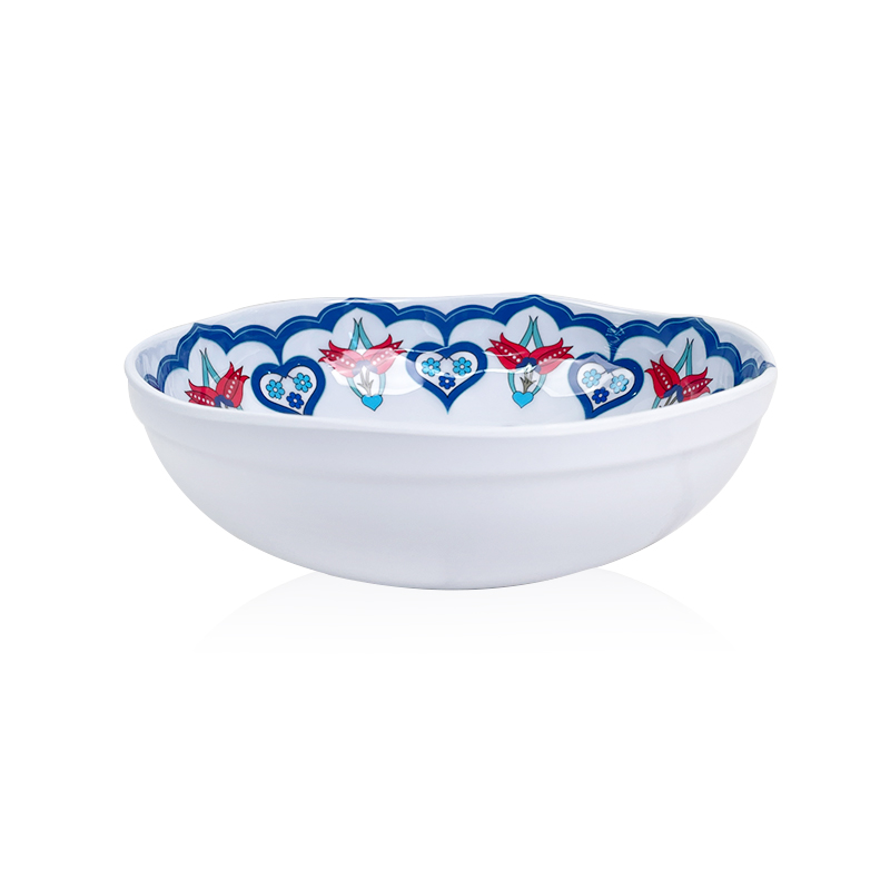 Kila mshororo wa Bakuli hizi za Melamine za Muundo wa Mapambo husimulia hadithi. Ukingo huo una michoro iliyochorwa na motifu zenye umbo la moyo, huku sehemu ya katikati ikichanua na miundo ya maua yenye tabaka—yote yakiwa yametolewa kwa wino nyororo na zinazostahimili kufifia. Iwe unauza kabonara ya kawaida au saladi maridadi ya kiangazi, ufundi wa bakuli huinua wasilisho, na kuwahimiza wageni kupiga picha za "ponografia ya chakula" (na uuzaji bila malipo kwa mkahawa wako).