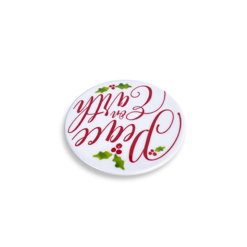 ఒక స్ఫుటమైన తెల్లని నేపథ్యం "పీస్ ఆన్ ఎర్త్" యొక్క ముదురు ఎరుపు లిపిని హైలైట్ చేస్తుంది - ఇది సెలవుదిన వెచ్చదనాన్ని గుసగుసలాడే అందమైన, చేతితో రాసిన శైలి ఫాంట్.