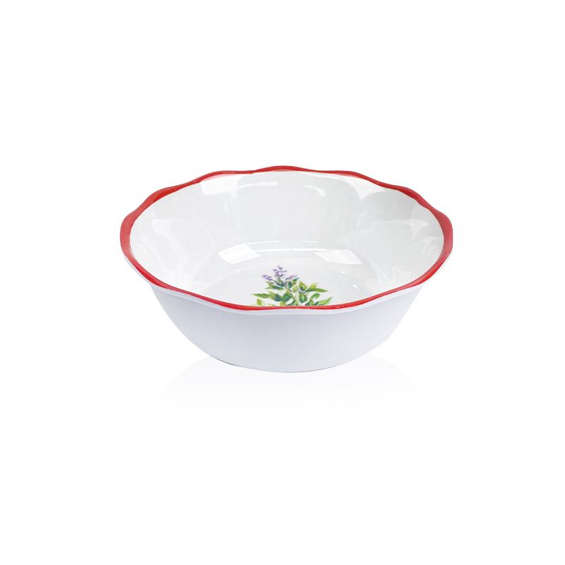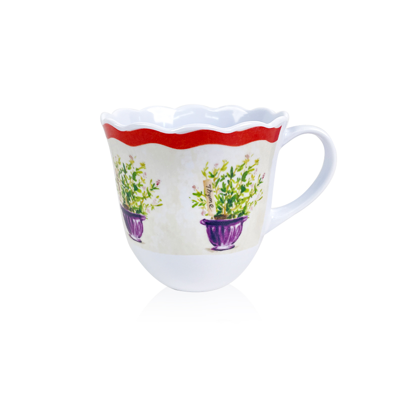 నార్డిక్ స్టైల్ థైమ్ హెర్బ్ ప్రింట్ మెలమైన్ కప్ – హోమ్ & రెస్టారెంట్ ఉపయోగం కోసం రెడ్ స్కాలోప్డ్ ఎడ్జ్ కస్టమ్ ఫ్యాక్టరీ థిక్ వాటర్ మగ్