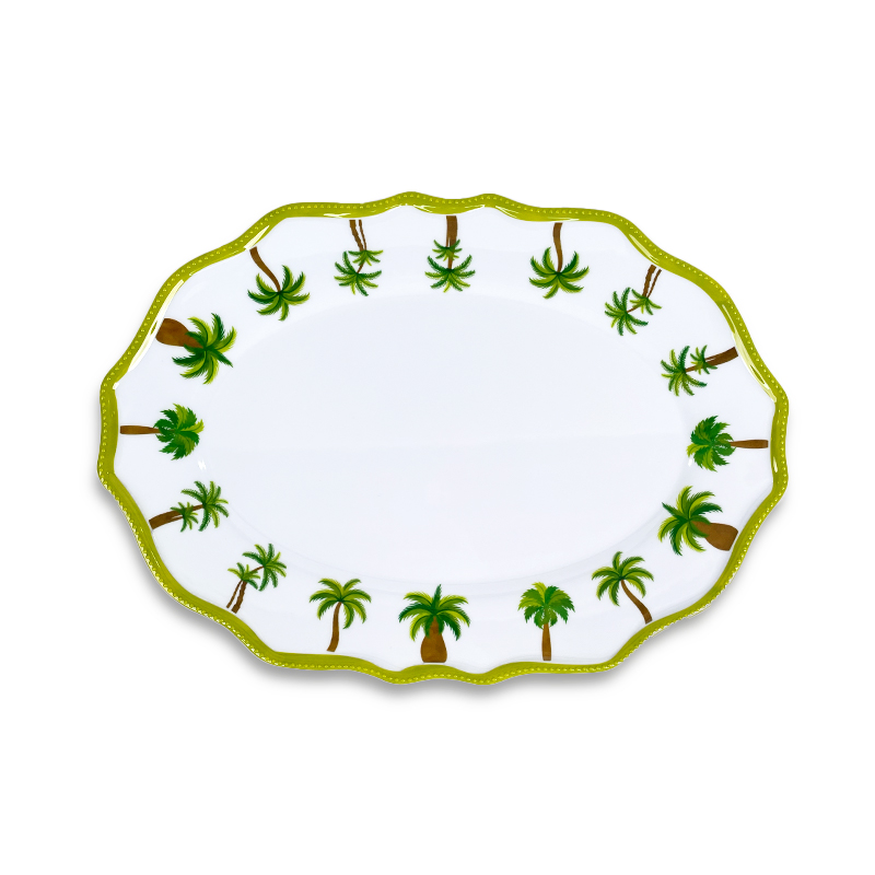 ట్రాపికల్ పామ్ ట్రీ ప్రింట్ మెలమైన్ ఓవల్ సర్వింగ్ ప్లేటర్ - రెస్టారెంట్ & హోమ్ డైనింగ్ కోసం గ్రీన్ స్కాలోప్డ్ ఎడ్జ్ ఎలిగెన్స్