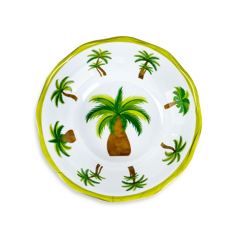 మా ట్రాపికల్ పామ్ ట్రీ ప్లేట్తో మీ భోజన అనుభవాన్ని సూర్యరశ్మిని ఆస్వాదించే ఉష్ణమండల స్వర్గానికి తీసుకెళ్లండి! ఈ మెలమైన్ ఓవల్ ప్లాటర్లో శక్తివంతమైన తాటి చెట్టు దృష్టాంతాలు మరియు చిక్ ఆకుపచ్చ స్కాలోప్డ్ అంచు ఉన్నాయి, ఇది రెస్టారెంట్లు మరియు గృహ వినియోగం రెండింటికీ గ్రీన్ స్కాలోప్డ్ మెలమైన్ ప్లేట్గా ప్రత్యేకంగా నిలుస్తుంది.