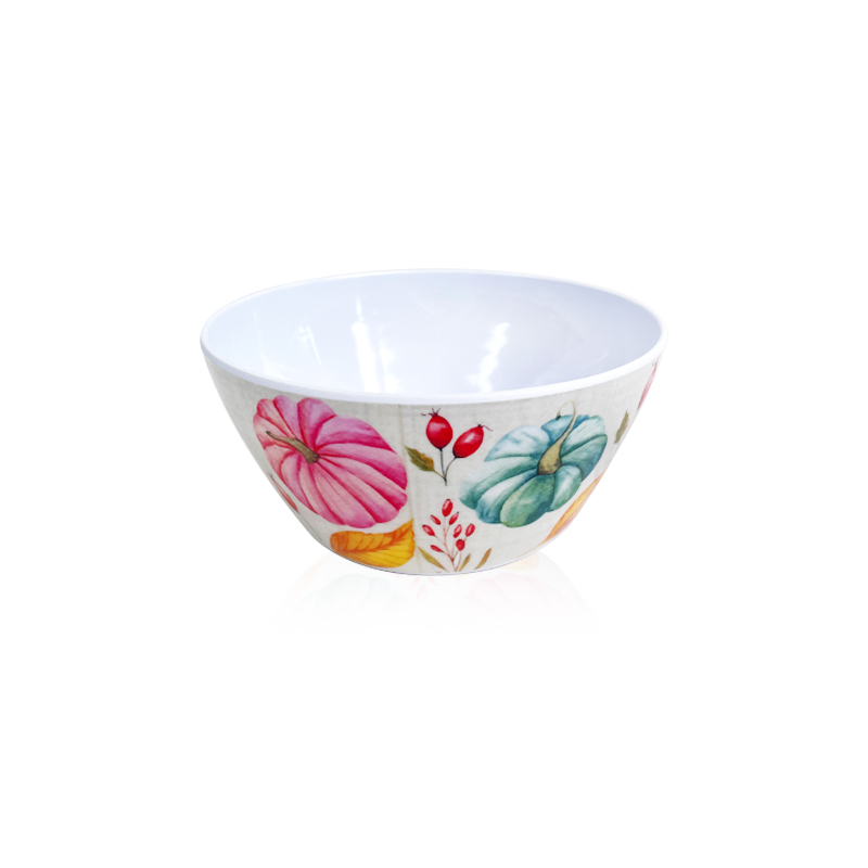 గుమ్మడికాయలు, ఉత్సాహభరితమైన శరదృతువు ఆకులు మరియు పంట వృక్షశాస్త్రాల సున్నితమైన జలవర్ణ చిత్రాలతో అలంకరించబడిన ఈ శరదృతువు గుమ్మడికాయ ఆకు ముద్రణ మెలమైన్ గిన్నె శరదృతువు స్ఫూర్తిని ప్రతిబింబిస్తుంది. మృదువైన రంగులు మరియు సంక్లిష్టమైన నమూనాలు దీనిని ఒక ప్రత్యేకమైన శరదృతువు పంట నమూనా మెలమైన్ గిన్నెగా చేస్తాయి, ప్రతి వంటకాన్ని సీజన్ యొక్క ఔదార్యానికి నివాళిగా మారుస్తాయి. మీరు క్రిస్పీ ఆపిల్ సలాడ్ను పూత పూసినా లేదా వెచ్చని బటర్నట్ స్క్వాష్ మెడ్లీని పూత పూసినా, డిజైన్ భోజనాన్ని గ్రామీణ ఆకర్షణతో పెంచుతుంది.