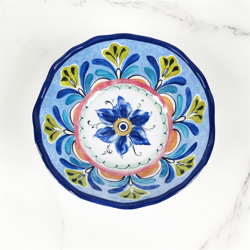 จานนี้เป็นจานอาหารทรงกลมมีลายดอกไม้สีน้ำเงินคลาสสิก มีเส้นผ่านศูนย์กลาง 26.6 ซม. สูง 2.4 ซม. เคลือบผิวมัน เคลือบด้านด้านหลัง มีวงกลมมากมายทั้งบนพื้นผิวและด้านหลัง ดูมีเอกลักษณ์มาก สามารถใช้จานนี้วางสเต็กทอด ปลาหมึกทอดได้酥炸鱿)or นึ่ง กุ้งล็อบสเตอร์และอื่นๆ หลังอาหารเย็น เรามักจะทานของหวานกัน จานนี้เป็นจานทรงกลมสำหรับของหวาน มีเส้นผ่านศูนย์กลาง 21.5 ซม. สูง 2 ซม. ฝีมือทำเหมือนกับจานอาหารค่ำเลย เราสามารถใส่คุกกี้ เค้กชิ้นเล็กๆ หรือบิสกิตลงไปได้ หรือจะเติมซอสผลไม้ลงไปก็ได้ รับรองว่าอร่อยยิ่งขึ้น