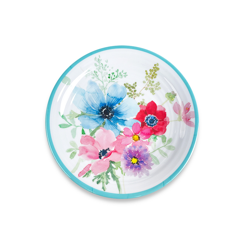 Elevate every meal—whether in bustling restaurants or cozy homes—with our Wholesale Custom Watercolor Floral Melamine Dinner Plate with Turquoise Rim:a visually stunning Dinner Plate that blends artful design with workhorse durability, perfect as standout Restaurant Home Dining Dishes for businesses and stylish tableware for households.
