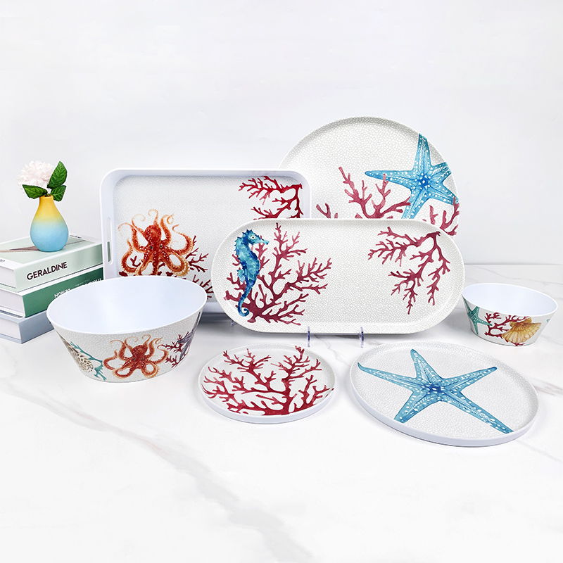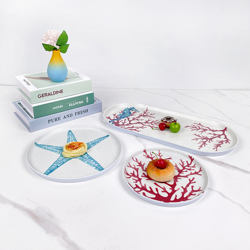Wholesale Hot Selling Oval Melamine Tray Seahorse Coral Pattern Custom Logo Service Tray for Home Hotel Daily Use Good Quality