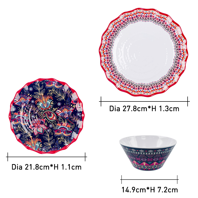 Our Bohemian Style Melamine Dinnerware Set, a perfect blend of vibrant design and durable functionality.